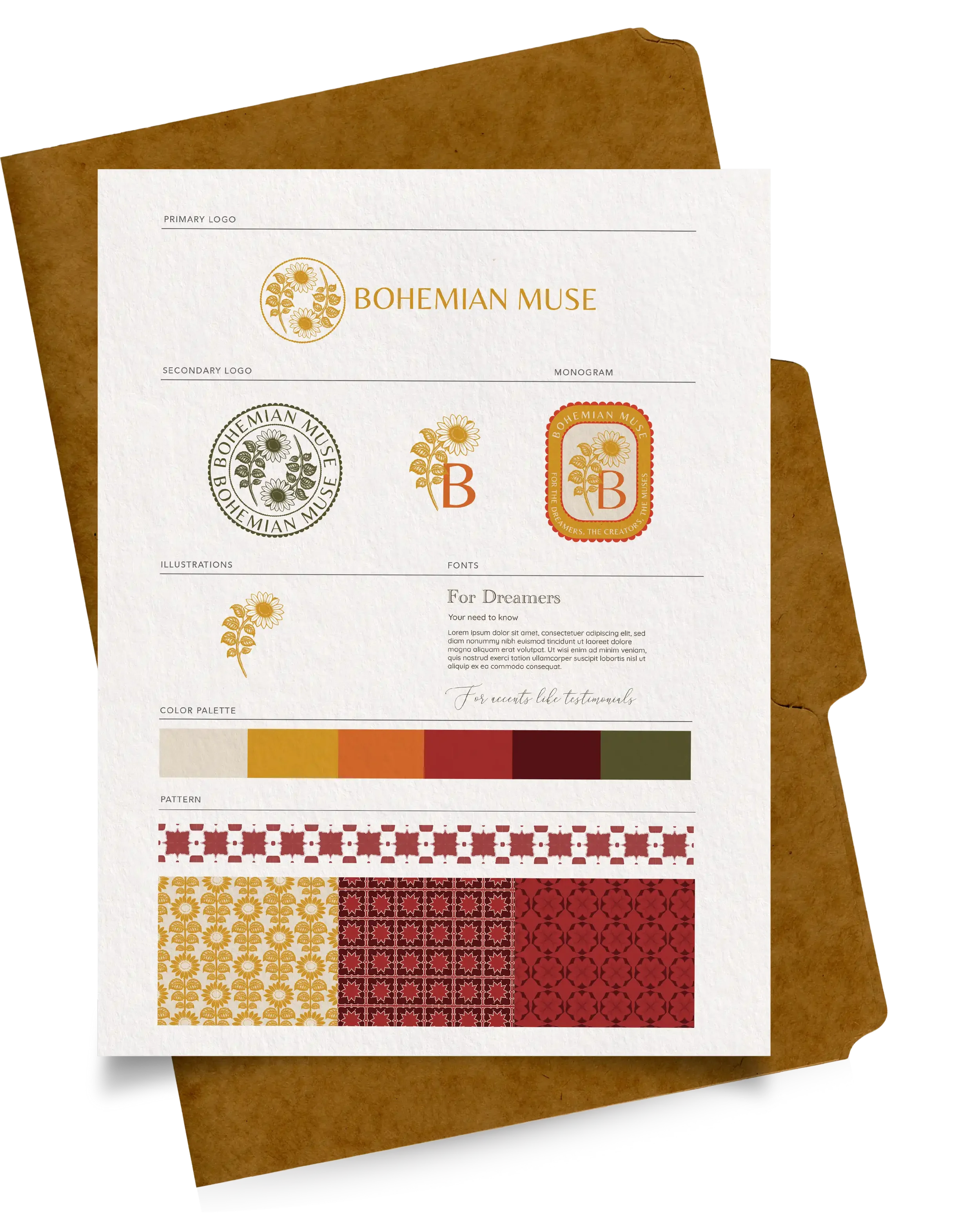Is a semi-custom luxury brand identity inspired by artistic expression, vintage botanical illustration, and symbolic storytelling. Featuring warm golden hues, earthy reds, and intricate sunflower motifs arranged in a balanced yin-yang composition, this identity represents harmony, creativity, passion, and timeless craftsmanship.